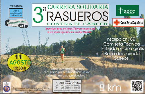 * Los dorsales podrán retirarse el viernes 10 de agosto de 18h. a 20h. en las Piscinas Municipales de Rasueros y el sábado 11 de agosto de 12h. a 14h. en las Piscinas Municipales de Rasueros, y de 17h. a 18:30h en el stand habilitado para ello en la zona de salida-meta.