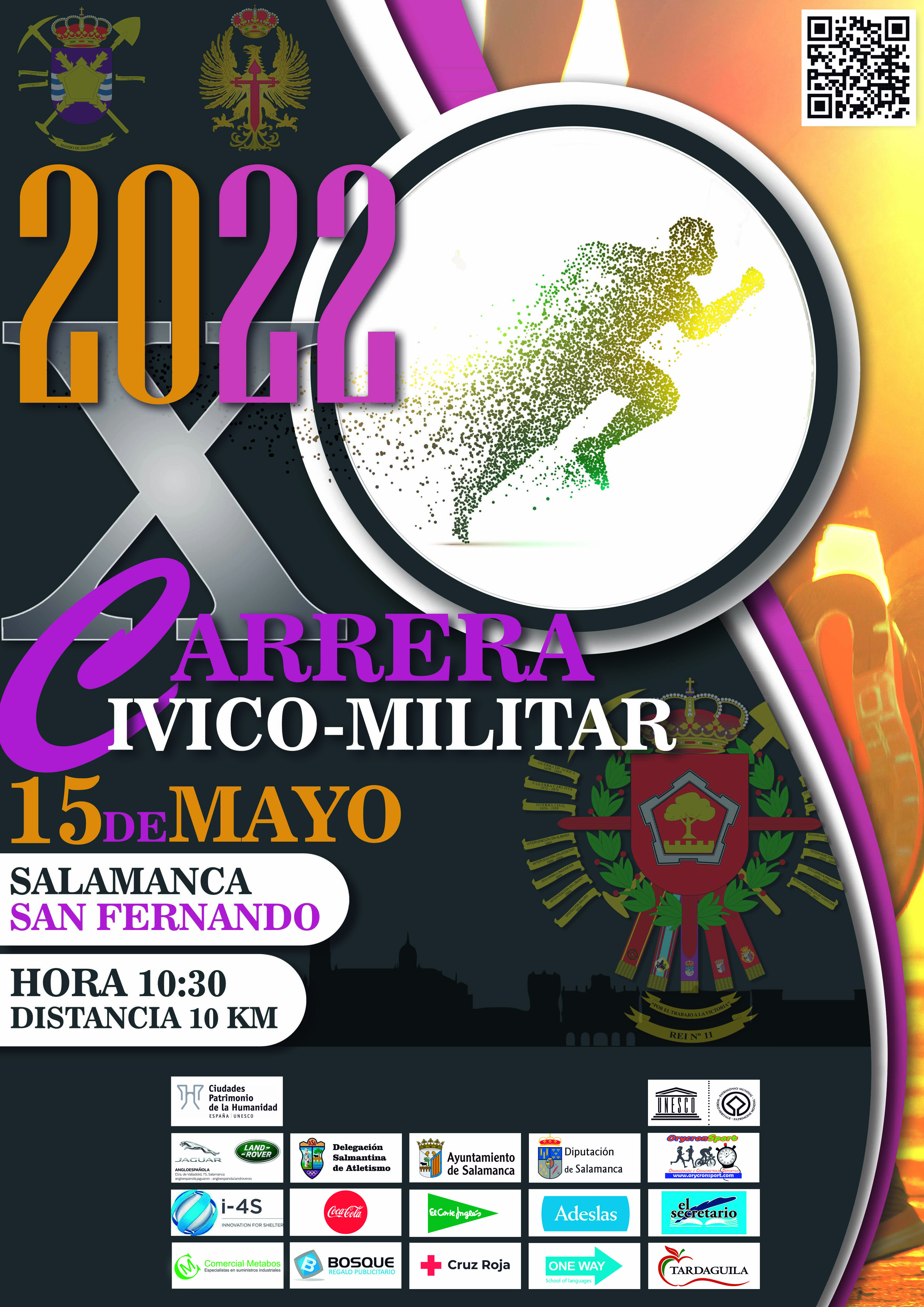 * Los dorsales podrán retirarse en el Acuartelamiento “General Arroquia” (Av. Torres Villarroel nº 65) durante los días 12,13, y 14 de mayo en horario de tarde (de 16:30 h. a 20:30 h.) y el 15 de mayo, día de la carrera (de 08:00 h. a 10:00h.).