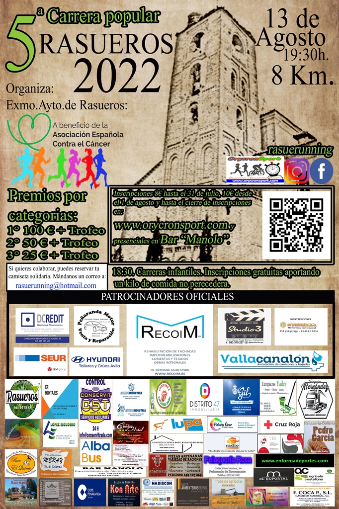 * Los dorsales podrán retirarse el sábado 13 de agosto de 12h. a 14h. y de 16:30h. a 18:30h. en el Ayuntamiento de Rasueros.